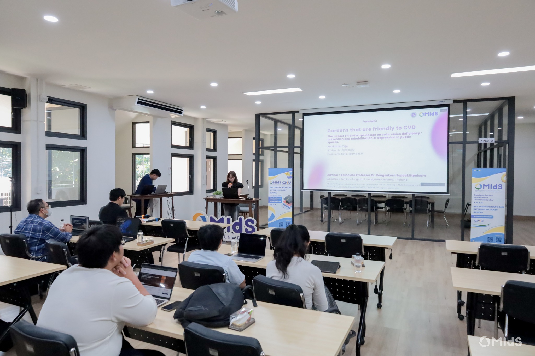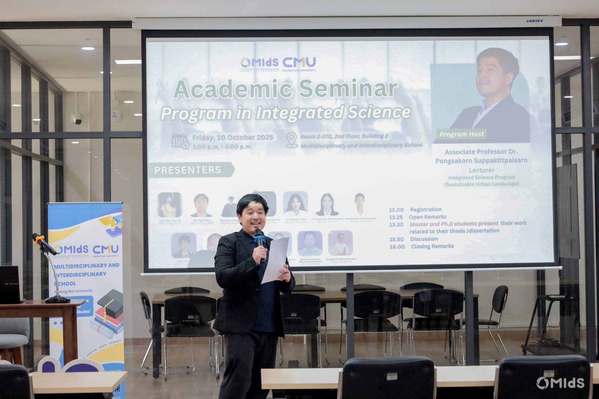 วันศุกร์ที่ 10 ตุลาคม 2568 สาขาวิชาบูรณาการศาสตร์ วิทยาลัยพหุวิทยาการและสหวิทยาการ จัดสัมมนาวิชาการให้กับนักศึกษา MIdS และผู้สนใจเข้าร่วมในระดับบัณฑิตศึกษา เพื่อเป็นการแลกเปลี่ยนเรียนรู้แนวคิดด้านงานวิจัยผ่านการนำเสนอจากนักศึกษาในกลุ่มการเรียนรู้และงานวิจัยต่าง ๆ ของสาขาวิชาบูรณาการศาสตร์ (Integrated Science) โดยได้รับเกียรติจาก รองศาสตราจารย์ ดร.พงศกร ศุภกิจไพศาล อาจารย์ประจำหลักสูตรกลุ่มการเรียนรู้และวิจัยภูมิทัศน์เมืองยั่งยืน เป็นผู้ดำเนินรายการอภิปราย และร่วมรับฟังให้ข้อเสนอแนะแก่นักศึกษา ณ ห้อง 2-202 อาคาร 2 MIdS CMU