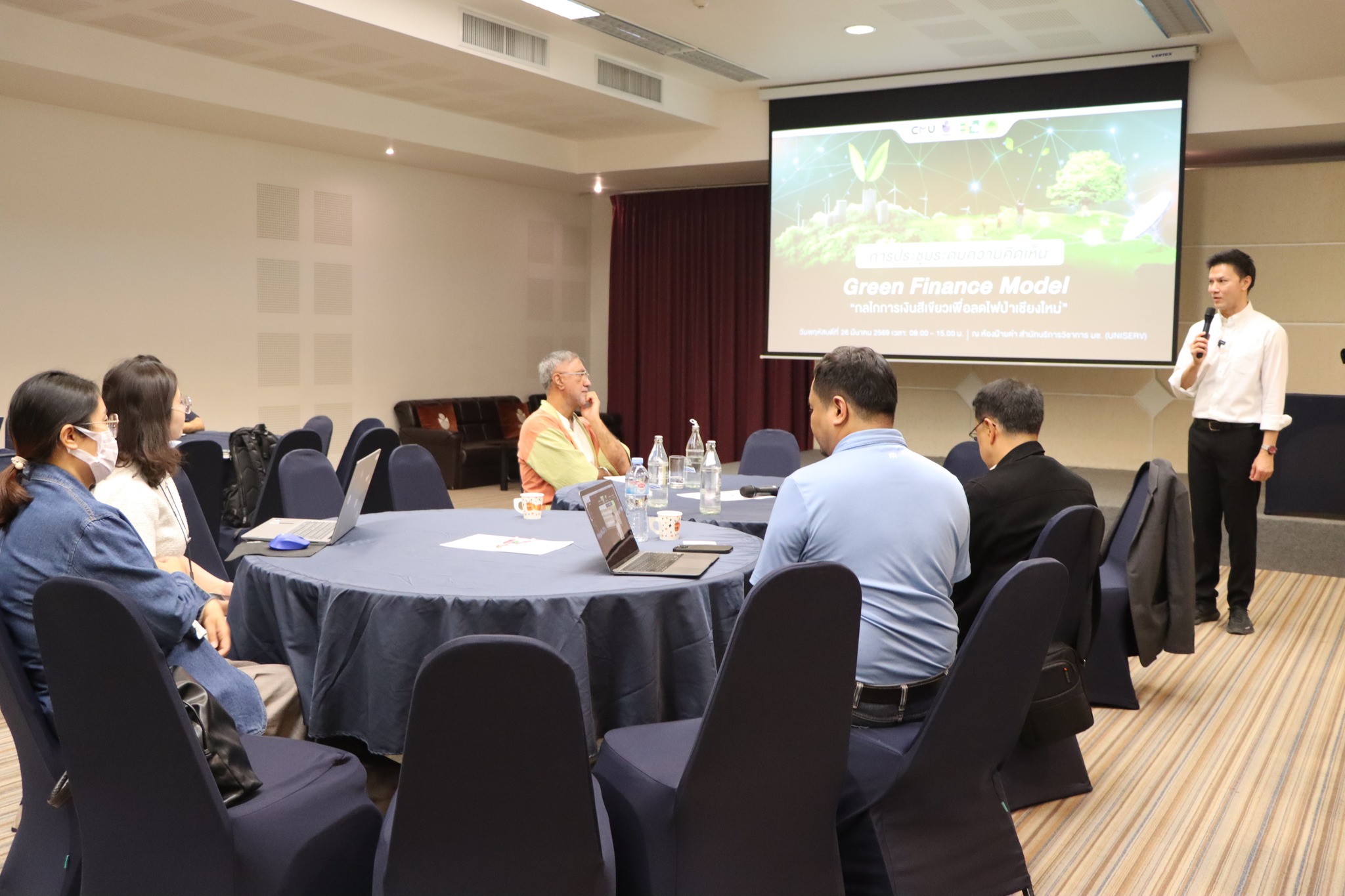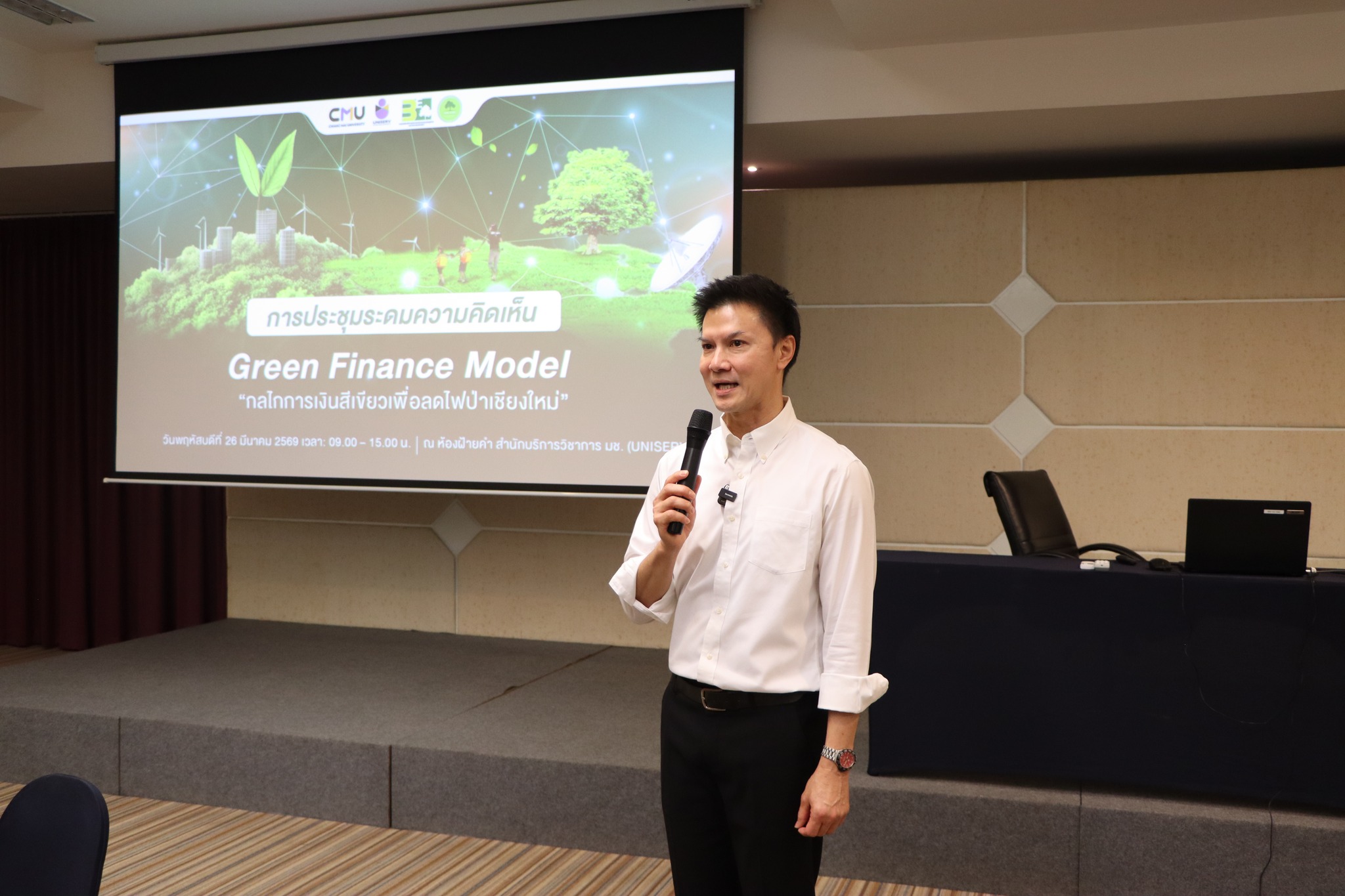 วันพฤหัสบดีที่ 26 มีนาคม 2569 สำนักบริการวิชาการ มหาวิทยาลัยเชียงใหม่ จัดประชุมระดมความคิดเห็นหัวข้อ “Green Finance Model กลไกการเงินสีเขียวเพื่อลดไฟป่าเชียงใหม่” นำโดย ศาสตราจารย์ปฏิบัติ ดร.เศรษฐ์ สัมภัตตะกุล ผู้อำนวยการสำนักบริการวิชาการ มช. โดยมีผู้แทนจากภาคเอกชน ภาครัฐ ภาคการศึกษา และภาคประชาสังคม ณ ห้องฝ้ายคำ สำนักบริการวิชาการ มช. และผ่านระบบ Zoom